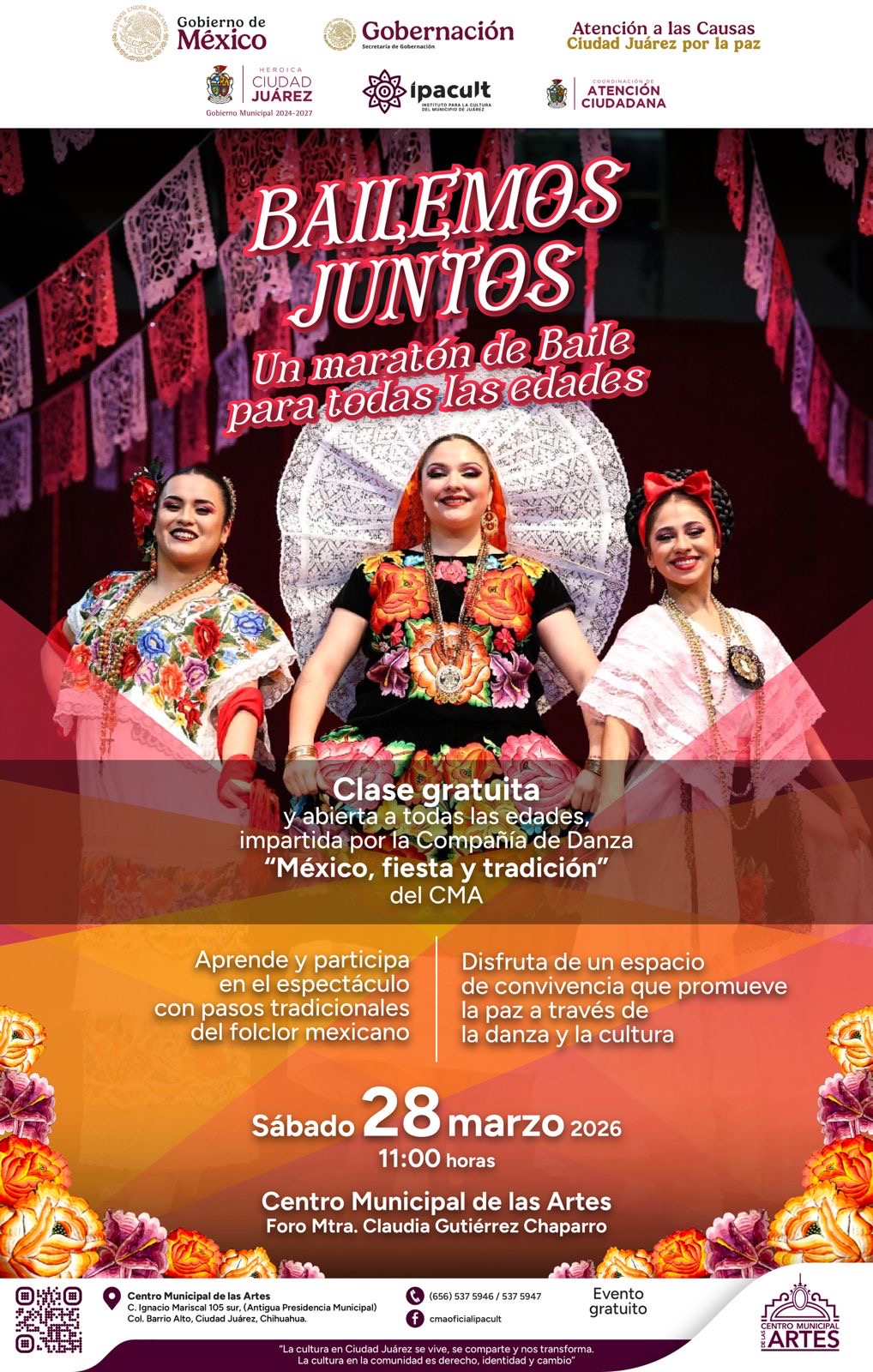 El evento contará con una clase gratuita impartida por la Compañía de Danza “México, fiesta y tradición” del Centro Municipal de las Artes, donde las y los asistentes podrán aprender pasos tradicionales del folclor mexicano y participar en una jornada de expresión artística colectiva.