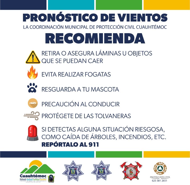 La Coordinación Municipal de Protección Civil informó que para los días 5 y 6 de marzo se prevé la presencia de fuertes vientos con posibles rachas de hasta 65 kilómetros por hora, por lo que, en apoyo con las corporaciones de seguridad y auxilio, se han emitido una serie de recomendaciones preventivas a la población con el fin de evitar incidentes y daños materiales.