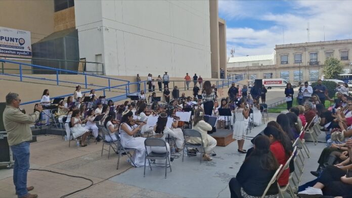 Autoridades educativas del estado llevaron a cabo el concierto “A una Voz”, interpretado por la Orquestrina Femenil Chihuahua en la explanada de la Plaza de la Revolución, como parte de las actividades organizadas durante la Semana de la Mujer.